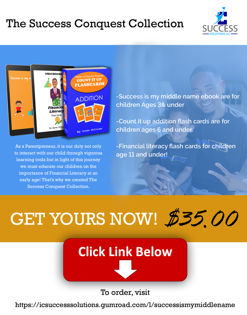 Success is my Middle Name ebook for children ages 3 & under. Count it up Addition flash cards are for children ages 6 and under. Father of Success Financial Literacy learning cards for preteens. The most inspiring thing a parent could ever do is set their child up for success by actively engaging and teaching the necessary tools to a brighter future. 30% off Discount code winter for the next 20 customers
